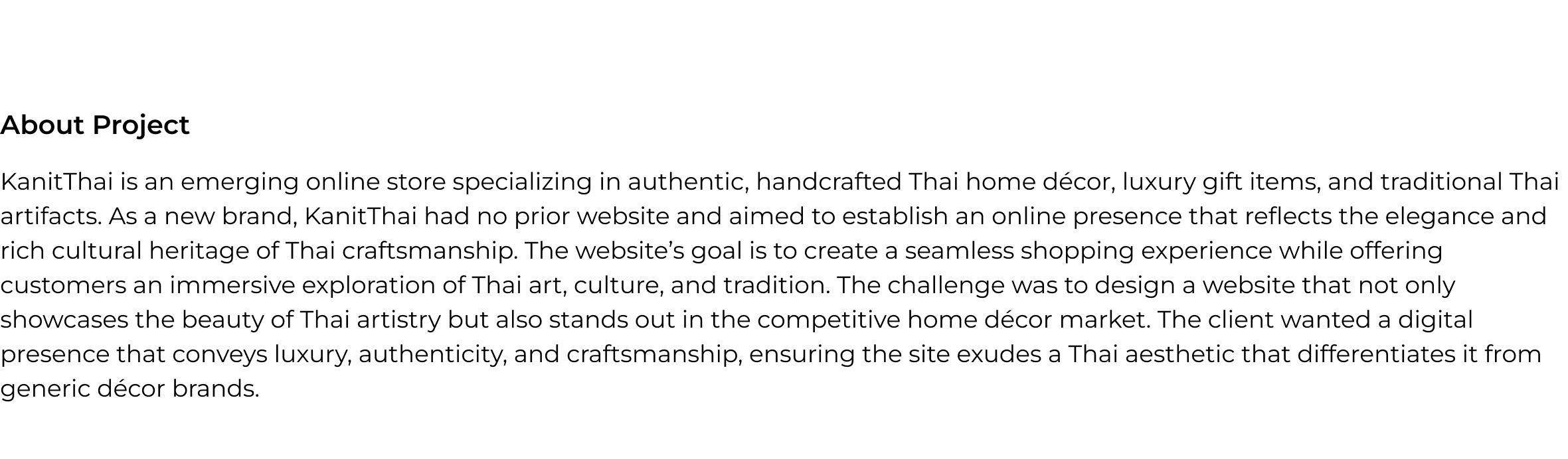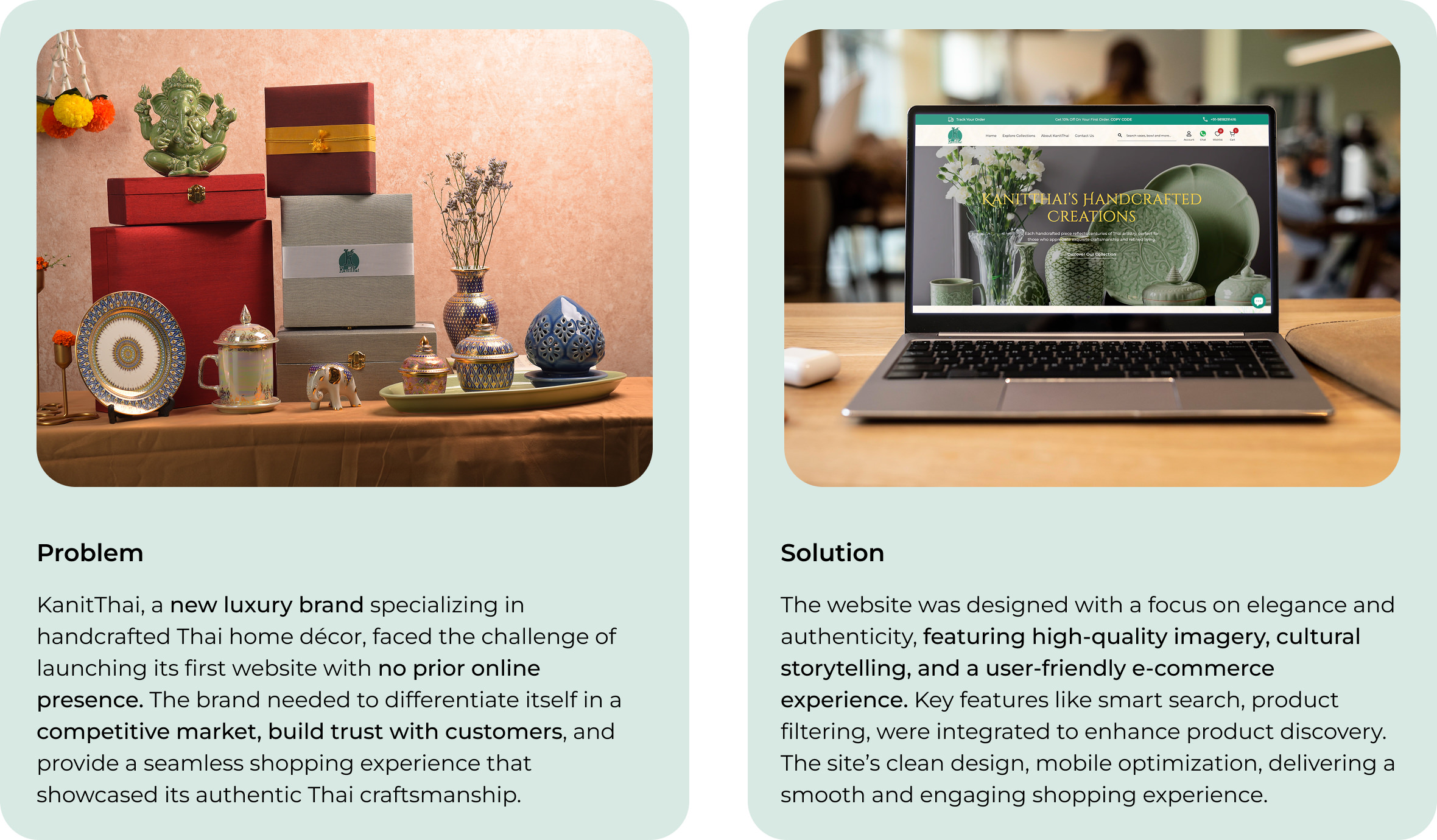 KanitThai is a newly launched brand specializing in high-end, authentic Thai home décor, luxury gift items, and traditional handcrafted artifacts. As a new player in the luxury home décor market, KanitThai sought to create a website that reflects its rich cultural heritage while providing an intuitive, high-end e-commerce experience for discerning customers.